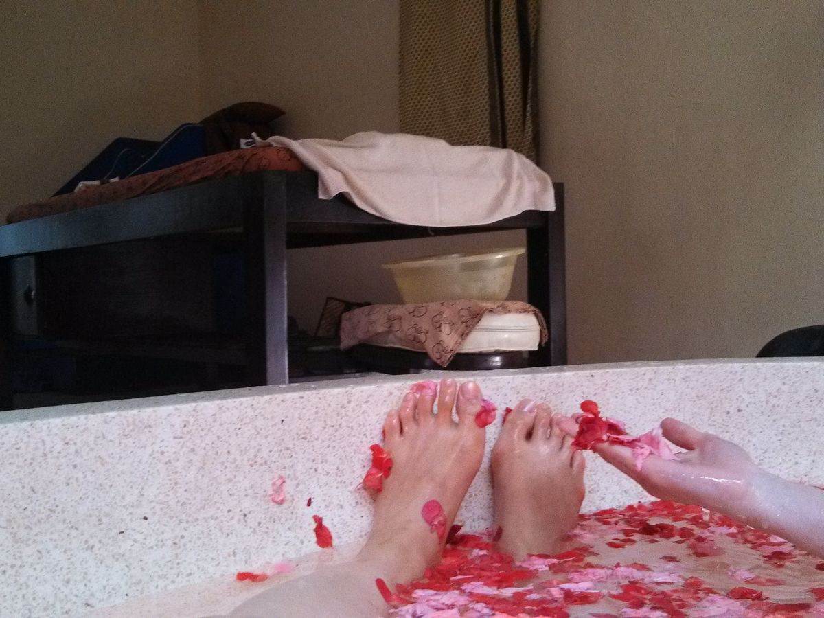 オイルマッサージとシロダーラのパッケージメニューを施術していただきましたが、今回行ったスパの中で一番の上手さで主人共々何度も夢の中へと連れて行かれてしまい~せつかくの極上のひと時をフルで堪能出来ずに良い意味で残念でした笑)横向きで腕を上げてのマッサージは初めての体験でしたがとろけるほど気持ちが良かったです。施術後のフラワーバスも花びらがタップリと浮かべられていて最後まで至福の時間を過ごせました。
