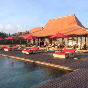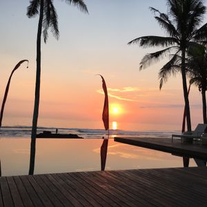 次にタナロット寺院に行きました。観光客がとても多く、夕日が沈む様子を見るためにたくさんの人が芝生の上に座っていました。インド洋の海の崖の上に建てられた寺院は満潮のため遠くからでしたが綺麗でした。最後に夕食を食べに少し離れた海の前に建てられたヴィラのレストランに行きました。サンセットを見ながらインドネシア料理のフルコースをお腹いっぱい食べました。目の前はインド洋の地平線と空しか見えない景色の夕日はとてめ綺麗で感動で涙が出るほどでした。今度は泊まりに来たいと思うほどとても綺麗なヴィラでした。貸切状態のレストランで心ゆくままに絶景を見ながら料理を堪能する事ができ、とても思い出に残る日になりました。