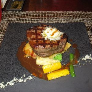 夕食はパンパシフィックホテルのレストランにて,タナロット寺院を遠くに臨む絶景のテラス席で前菜+メイン+デザートのミニコースをいただきました.量的には成人男性でもちょうどよいくらいだと思います(飲み物代は別料金).料理の内容も総じて満足の行くものでした.