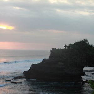 初めてのバリ島。到着してからあちこち観光をして、一番最後に観光できる帰国前日にタナロット寺院の夕日鑑賞をしました。迎えにきてくれたガイドさんは、とっても面白い人で、ドライバーさんも明るく楽しい人でした。渋滞を見越して多めに移動時間をとってくれていたうえ、渋滞せずスムーズにつけたので、夕日を見るまでにもたっぷり時間がありのんびりタナロット寺院とその周辺の観光を楽しむことができました。タナロット寺院の建っている海辺は波が高く、大きな波が繰り返し寄せては壊れ迫力のある場所でした。駐車場から歩いて行くと、まずは崖の上からそんな海の景色が見え、続いて崖の上に寺院が見えてきます。その寺院の先端からは、遮るもののなにもない雄大な景色が見えます。更に進んでいくと、海辺の大きな岩の上にお寺が見えました。岩の下からは海にも関わらず真水が湧いているとか。ガイドさんの丁寧な説明もあり、より楽しい観光になりました。あちこち散策し、いよいよ夕日の時間に。いくつかおすすめの場所を教えてもらい、私たちは崖の上のテラスからビールを飲みながら鑑賞する事にしました。その場所までは少し坂をあがるのですが、狭くて細い道の両脇にお店があったりして、そこを歩くのも楽しかったです。夕日自体は残念ながら、海の中に落ちる辺りに雲がかかってしまい、最高の落日とはいきませんでした。ガイドさんが言うには、そこまで見れるのは月の三分の一ぐらいだそうです。しかし、夕日は散策中にたっぷり見られていたので、充分満足できる観光でした。ガイドさんの日本語は完璧ではありませんでしたが(難しい言葉をあまり使いません。でも彼がどうのというのではなく、どうやらバリ島のガイドさんのレベルが他のアジアの国のガイドさんに比べてそれほど高くはないように感じました。どの観光のガイドさんもそんな感じでしたので)バリ島について様々な情報を教えてくれ、ユーモアたっぷりの方でしたので、また彼の案内で観光をしてみたいなと思いました。バリ島に行かれる方には本当におすすめの観光でした。
