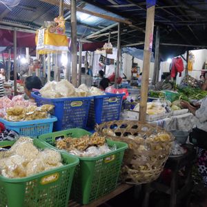 4時半頃、これから使うお供えもののお花やお線香やサンライズのときに食べるおやつのために、村の朝市で買い物をするというので、私たちも市場について行きました。日の出前の暗闇の中、たくさんのご婦人方が集まっていました。魚、野菜、いも類、花、お供え用の編んだ入れ物、お菓子、どれも興味深く、バリ人の生活に触れることができました。