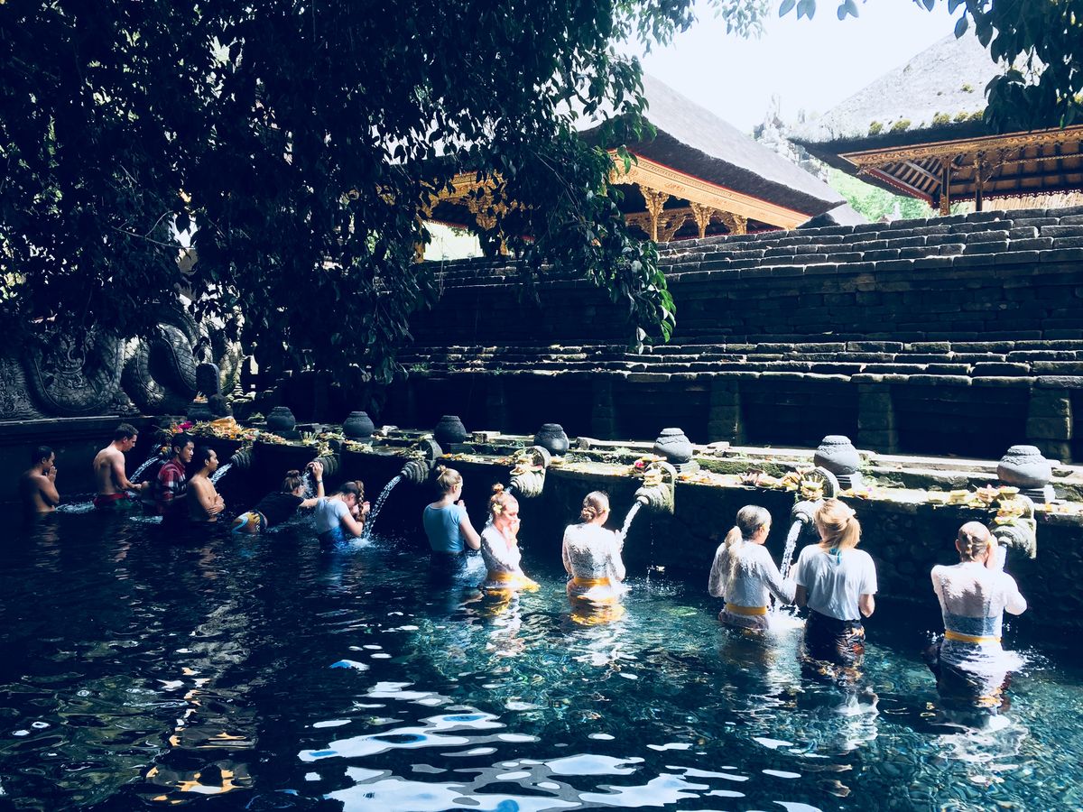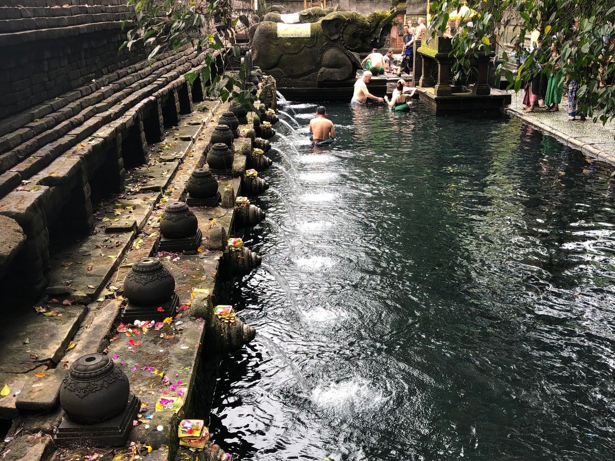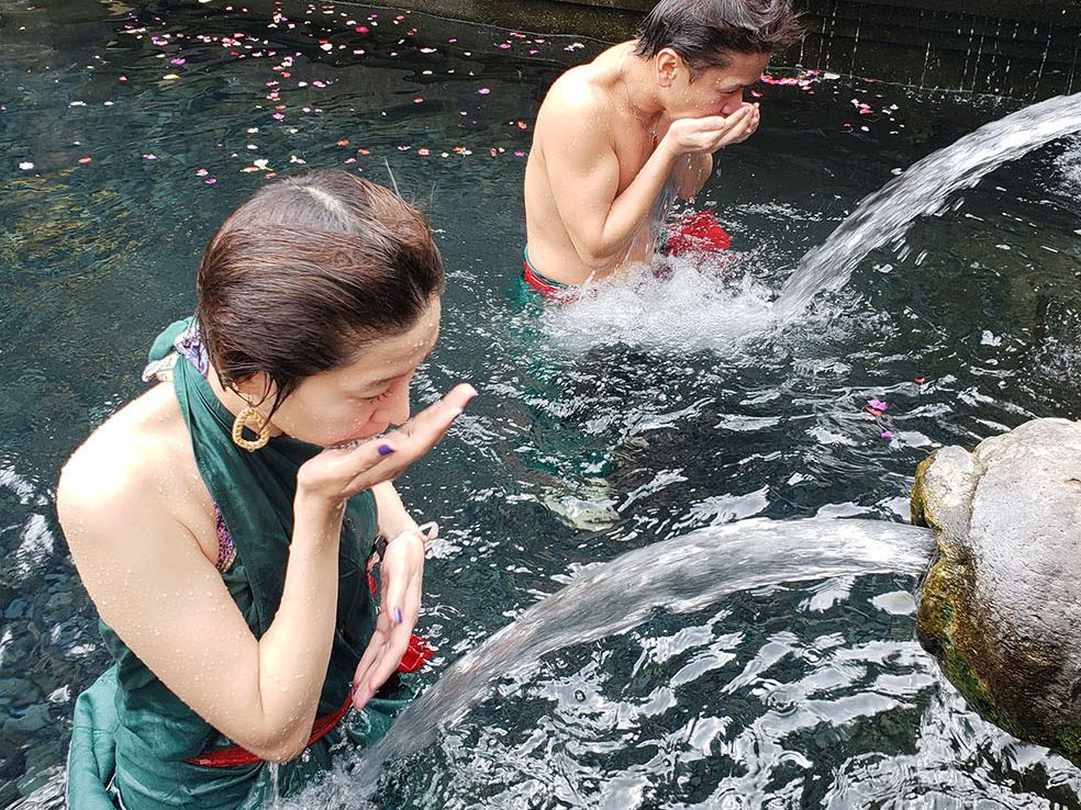 パワースポットのティルタ・エンプル寺院で神秘的な聖水の湧き出る様子を見、沐浴の決めごと等を教えてくれました。