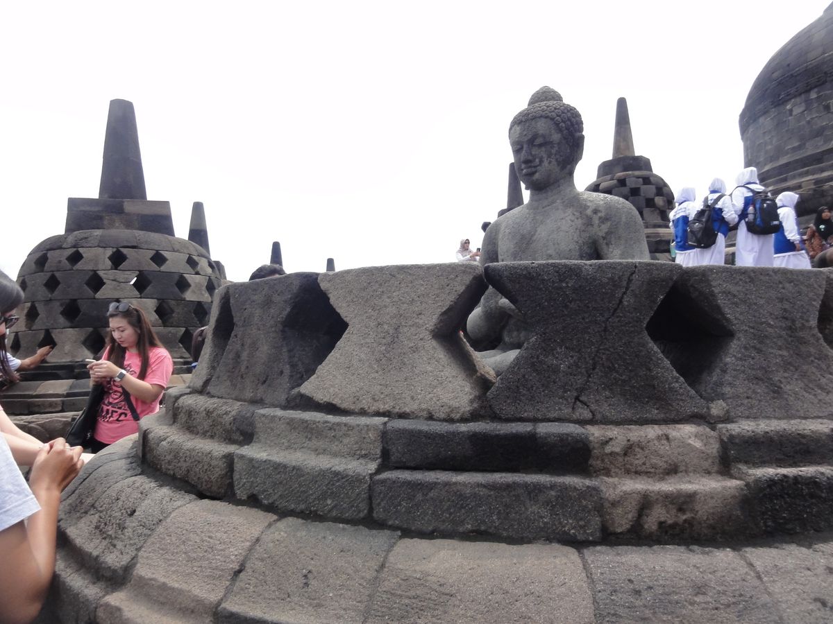 まず最初にボロブドゥール遺跡を訪問。早い時間帯の訪問だったので、それほど人もおらずゆっくりと見て回る事が出来ました。ボロブドゥール遺跡ではガイドのbaharさんはガイドが出来ない(ボロブドゥール遺跡遺跡専用のガイドさんに案内してもらわないとダメらしいのです)との事で、入口でいったん別の方にチェンジ(お名前失念してしまいました)。とても日本語が堪能で、ダジャレまで言う面白い方でした。壁に彫られた彫刻?は物語風になっており、ガイドの方が細かく説明してくださり、とてもわかりやすかったです。これはガイドさんがいなかったら理解できずに楽しめなかったと思います。ツアー利用で正解でした。