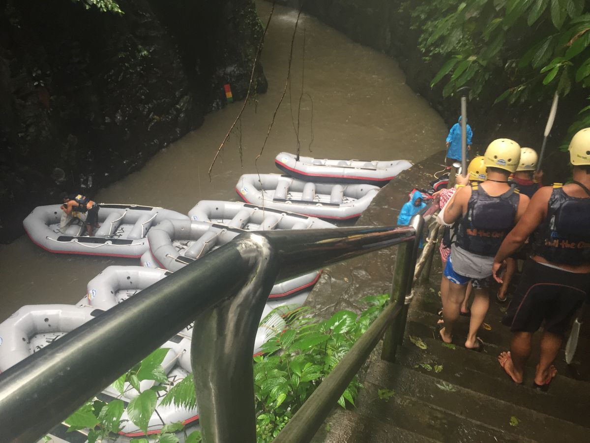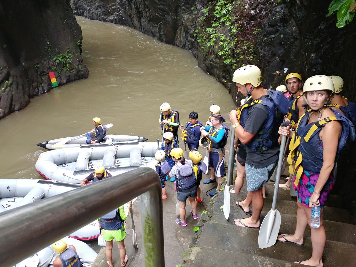 ラフティングの出発地点の上流までは、ここから車で15~20分程度。ここで自分に合ったライフジャケットとヘルメットを選んでもらい、参加者が揃うのを待ちます。バリ島内のいろんな場所から参加者が集まってくるため、この日は30分程度待ちました。全員が揃ってから出発となりますが、ひたすら階段を下り、川に行きます。ラフティング後も階段をひたすら上ることになりますが、下りのほうが膝にきますね...。