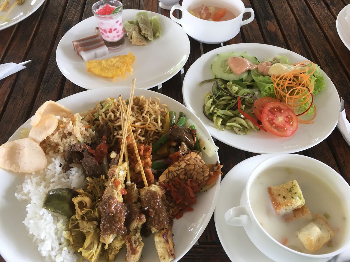 同じ建物の最上階にオープンエアーのレストランがあり、インドネシア料理のビュッフェのランチが用意されています。前菜、サラダ、スープ、肉料理、野菜料理、デザートまで種類も多く、かなりお腹一杯になります。飲み物代は別料金となりますが、ソフトドリンクが230円、ビールが350円程度です。忙しいと飲み物だ届くのが遅くなるので、早めにオーダーしましょう。ラフティング後のビールは最高です!