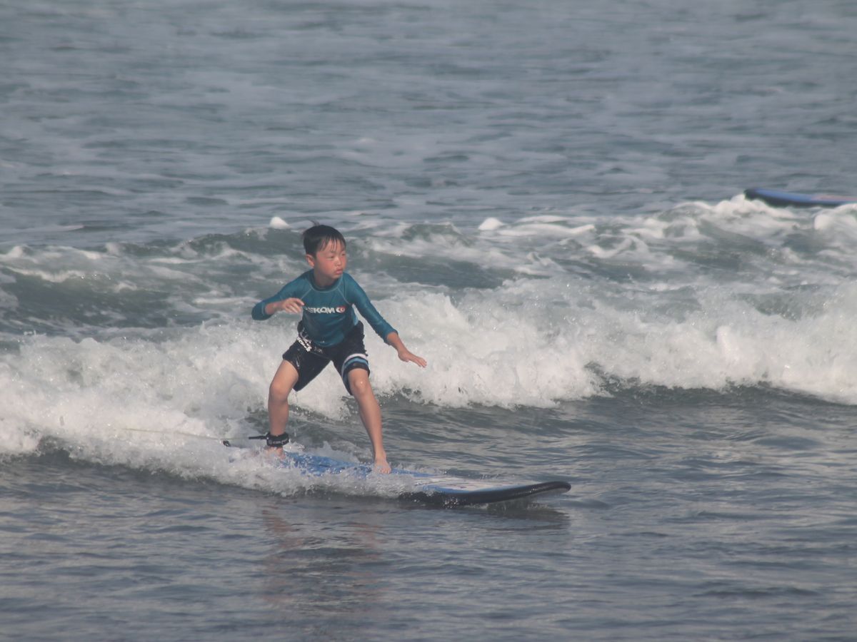 6歳からとのこと。侮っていました。セミプライベートレッスン、10歳の息子と二人で受けましたが、日ごろ運動をしていない私には結構ハードでした。1限目のレッスンでくたくた。休憩時間に私だけリタイア宣言をして、2限目は息子がワンツーマンでレッスンしてもらいました。私はほとんど波に乗れませんでしたが、息子は最初から立てました。2限目の1番最初のテイクオフ(?)はかなり長い間乗れていて、浜から見ていても我が子ながら、ちょっと格好良かったです。でも、息子も結構疲れた様子で、もっとやりたいと言うのかな、と思っていたら、もういいって。初めてのサーフィン体験、体力がないと大変でした。でも、なかなかできない経験だと思うので、良かったです。私たちは午後のレッスンにしましたが、朝の方が波の状態が良かったそうです。時間に余裕があり、確認できるのであれば、波の状態が良い時の方が乗りやすいみたいです。