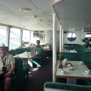 早く乗船すると上階のソファ席(写真)に案内されますが。下階の硬いイスの方が揺れがマシだと思います。