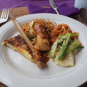 昼食は像を見ながらのレストランでビュッフェ(サラダ・スープ・肉料理・魚料理・デザート・フルーツ)インドネシアン料理美味しかったです。