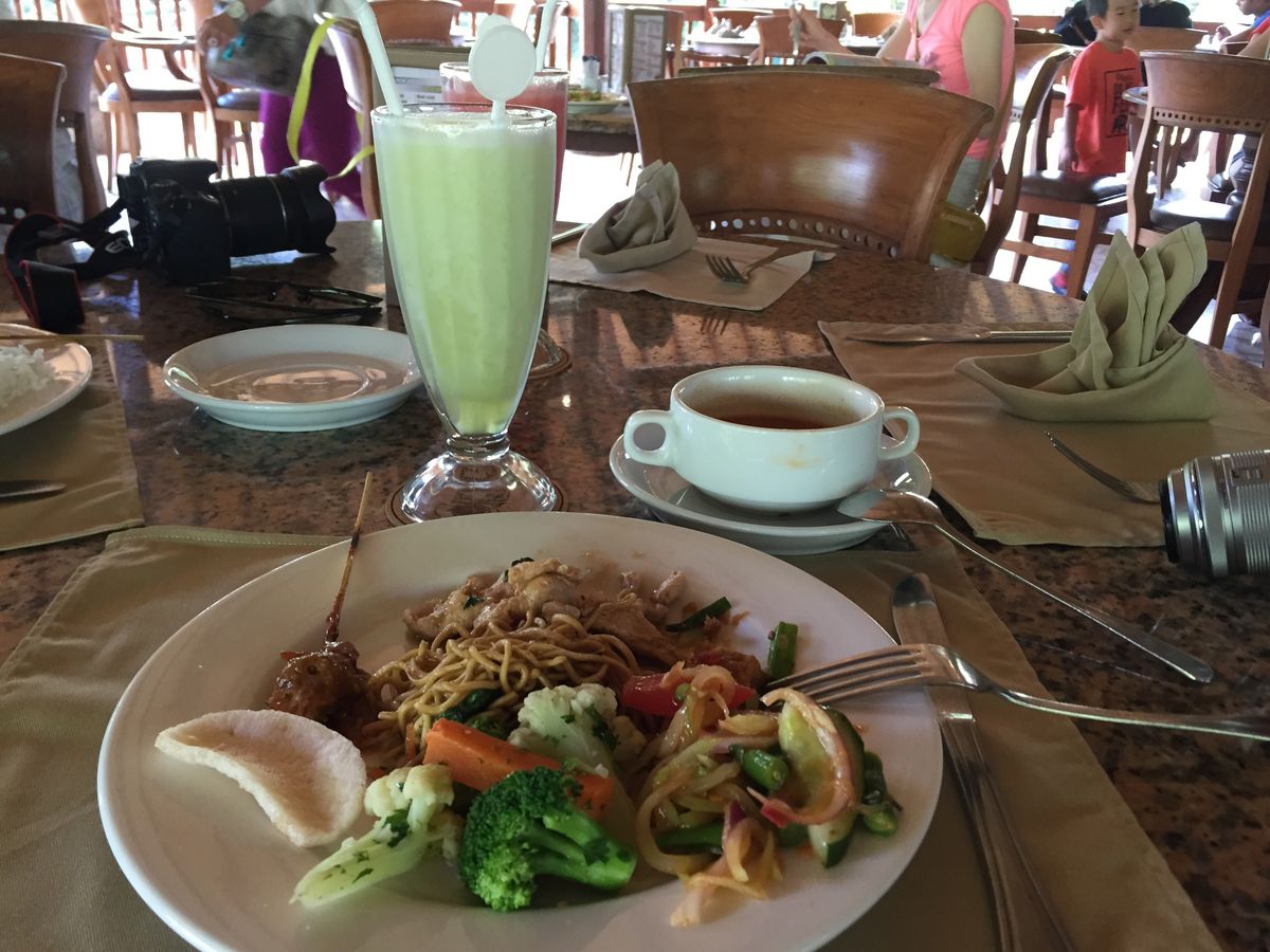お昼は11時頃からバイキング形式のインドネシア料理を食べました。ホテル併設のParkらしく、コテージのような整った施設で美味しく頂きました。(ドリンクは有料/約400円)
