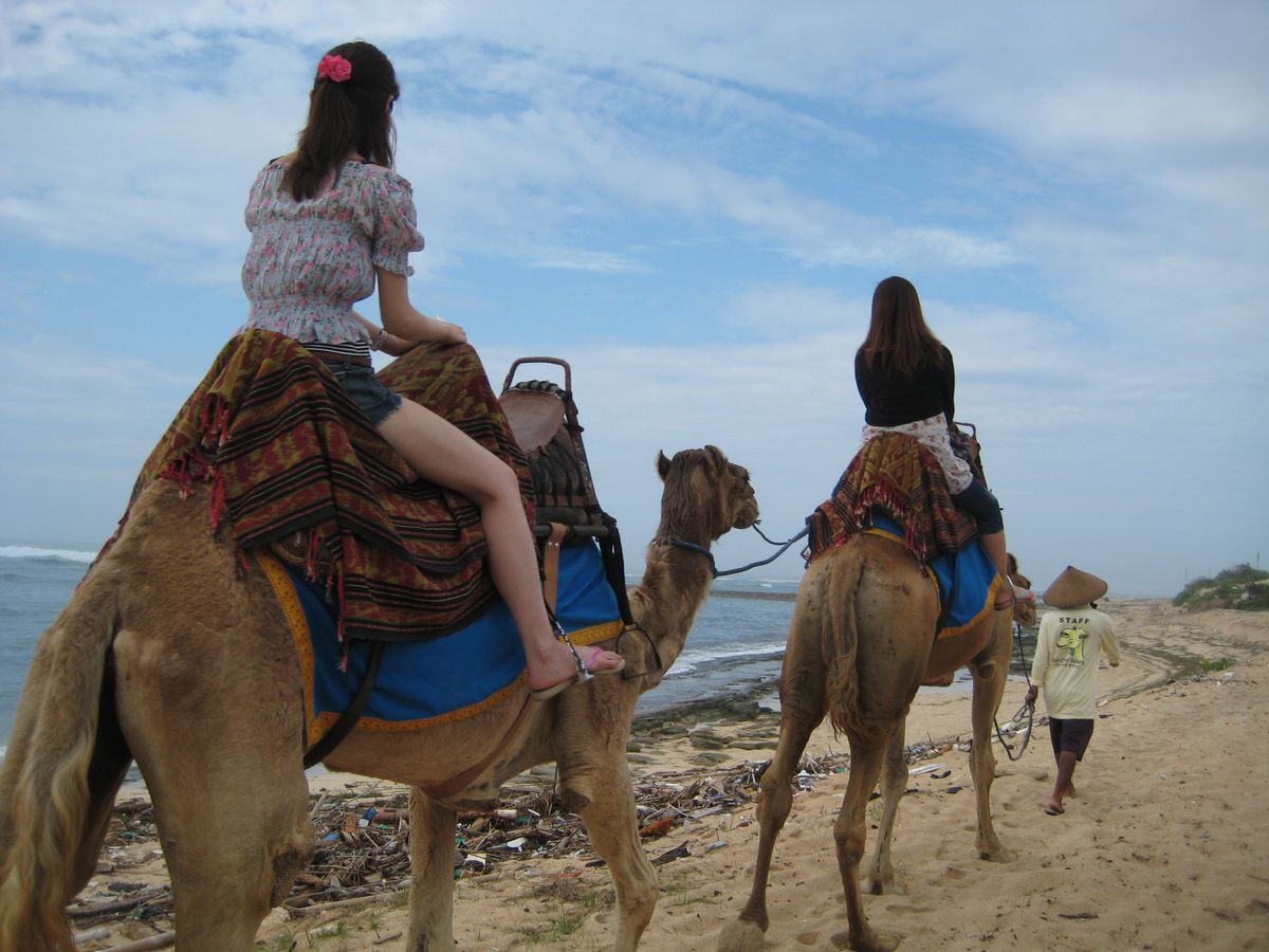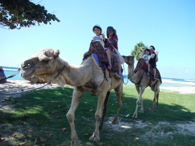思ったより乗り心地は良くてびっくり。3人で1頭は乗れないのでわかれて乗車。ラクダは足を折りたたんで座っている状態から乗り込みます。ガイドさんの合図でラクダがまず膝立ちになり本立ちになります。つまり二段階で立ち上がります。これが急に目線が高くなり子どもはおお泣き状態。しっかりつかまってないと振り落とされます。海岸沿いを歩いて行くのですが、海岸に打ち上げられた原木、ゴミはお世辞にもきれいとはいえませんでした。日航ホテルの横には新しいホテルが建設中。右には工事現場、左にはきれいな海、砂浜は汚い、そんなことが混在したラクダツアーでした。コスパはやや高いですが珍しい経験でした。ガイドさんは写真をいっぱいとってくれて日本語もじょうずでした。ラクダはオーストラリア産、ほとんど日本人の利用が多いようです。