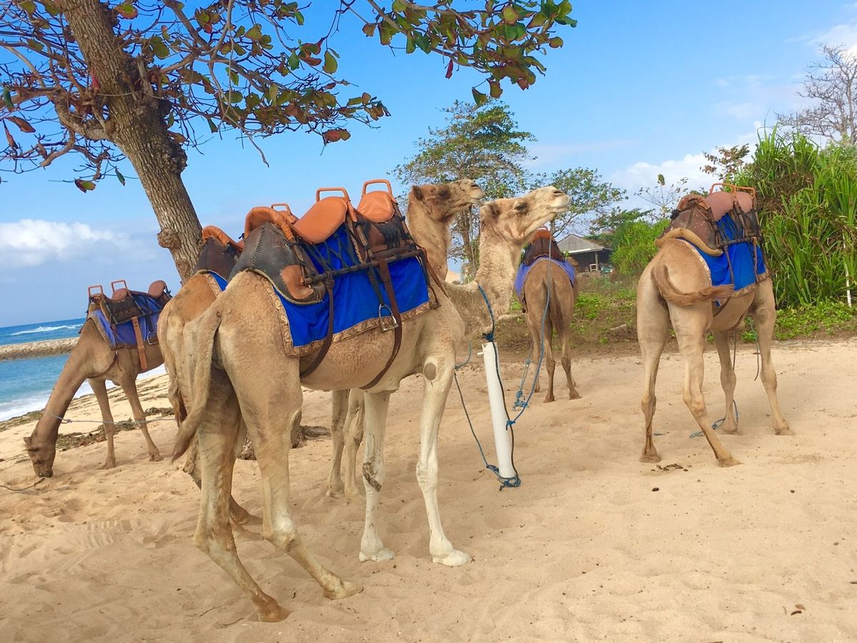 そこから、ビーチへ向かうと木の下でラクダ達がのんびり待機しています。