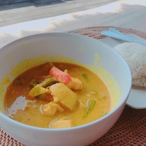 お昼は簡単なお弁当かなにかを想像していましたが、いくつかの中から選べて、チキンカレーを食べました。