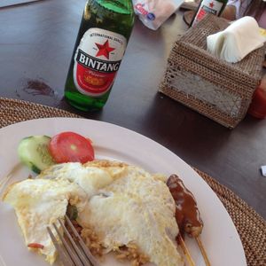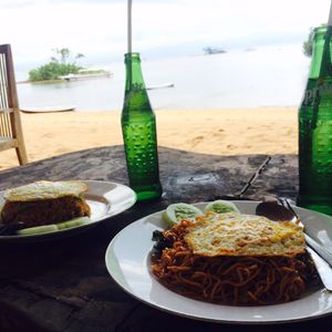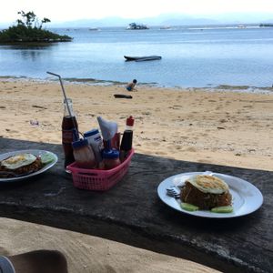 お昼はミーゴレンかナシゴレンかサンドイッチに飲み物が付いてきました!プライベートビーチで1時間ゆっくりご飯を食べたり寝たりできました。