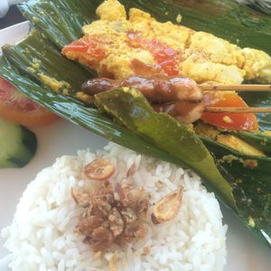 そこから車でサヌールビーチへ。寝坊により朝ごはんを食べていなかった私たちにご配慮頂き、ビーチ付近でバナナの皮に包まれたローカル朝ごはんを食しました。ハエが飛んでいるし、衛生面が気になりましたが、食べてみると香辛料が効いていて、辛かったですがとても美味しかったです!その後お腹が痛くなるようなこともありませんでした☻☆