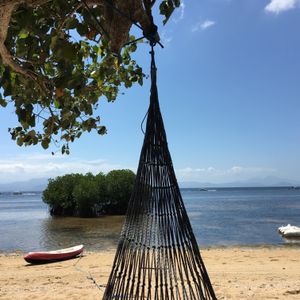 外でシャワーを浴びて、ローカル感溢れる脱衣所で着替えをしたら12時半から13時半までランチ休憩でミーゴレンやナシゴレンなどからメニューを選びました。ソフトドリンクも幾つか選べました。食べた後は、のんびり海を眺めながらビーチチェアで日焼けしたり、ハンモックでお昼寝したりしてすごしました。