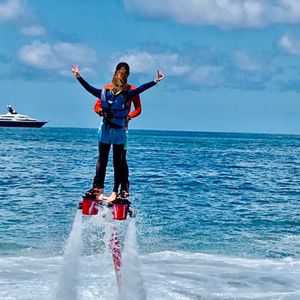 朝早かったですが、ツアー担当の方はホテルロビーに30分以上前に来てくれていたので、送迎時間は心配することはないと思います。到着後の保険などの説明は簡単なものですが、日本語話してくれるので安心。日本人もたくさんいました。ロッカーと更衣室はありますが古いです。説明を受ける場所からフライボードをする場所までは軽トラで10分程移動します。持っていく荷物は最小限にしたほうが良いです。私達は全てロッカーに預け水着になって手ぶらで行きました。(この時に防水カメラ持っていれば持って行ったほうが良い)到着したら直ぐにインストラクターが簡単な英語で説明してくれます。あまり聞き取れなくて心配でしたが実際にプレイすると感覚が分かるので、安心してください。トータル1人5分から10分と短いですが感覚をつかむと慣れてきて楽しめると思います。1人プレイしている間は1人は水上バイクにインストラクターとのって飛んでるところを見守っていられるのでこの時にお互いの写真撮れるチャンスだと思います!最後にインストラクターがカッコいいフライボードを披露してくれます!そのあとジェットスキーに三人乗りして、猛スピードで海上を走り最初の説明を受けた場所まで戻りました。少し海でのんびりした後シャワー浴びて帰りました。シャワーは外で冷水シャワーですが、砂を流す程度なら問題ないです。