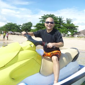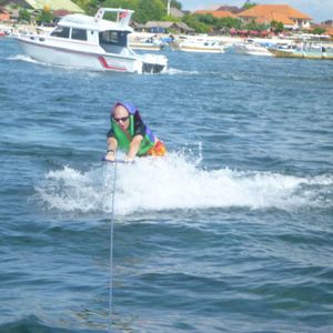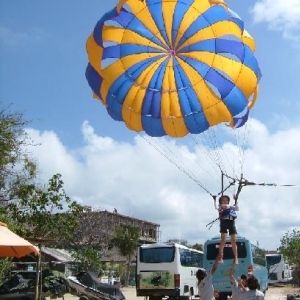 バリ2日目に参加しました。あいにく天気があまりよくなくてちょっと寒かったですが楽しかったです。バナナボート・ジェットスキー・パラセイリング・シュノーケルをしました。パラセイリングは初体験でどきどきものでした。ほんとなら海岸からスタートするらしいのですが私たちの時は風があまりよくなかったらしく海からスタートしました。海岸からのほうがもっと綺麗な景色が見られるとインストラクターは言っていましたが海からでも十分素敵な景色が見れました。8歳の娘と行きましたが娘はインストラクターと一緒に飛びました:)ジェットスキーは以前沖縄でしたことがありましたがそのときはインストラクターの運転でしたが今回は自分で運転させてもらえました 私は車もバイクも乗れないのですがジェットスキーは別物!すごくスピードも出るし、波が来たときなどは結構高くジャンプするしほんとに楽しかったです。かなりスピード狂の自分にびっくり^^;娘も自分で運転してました ちょっと怖かったらしくそんなにスピードは出していませんでしたけどね:)