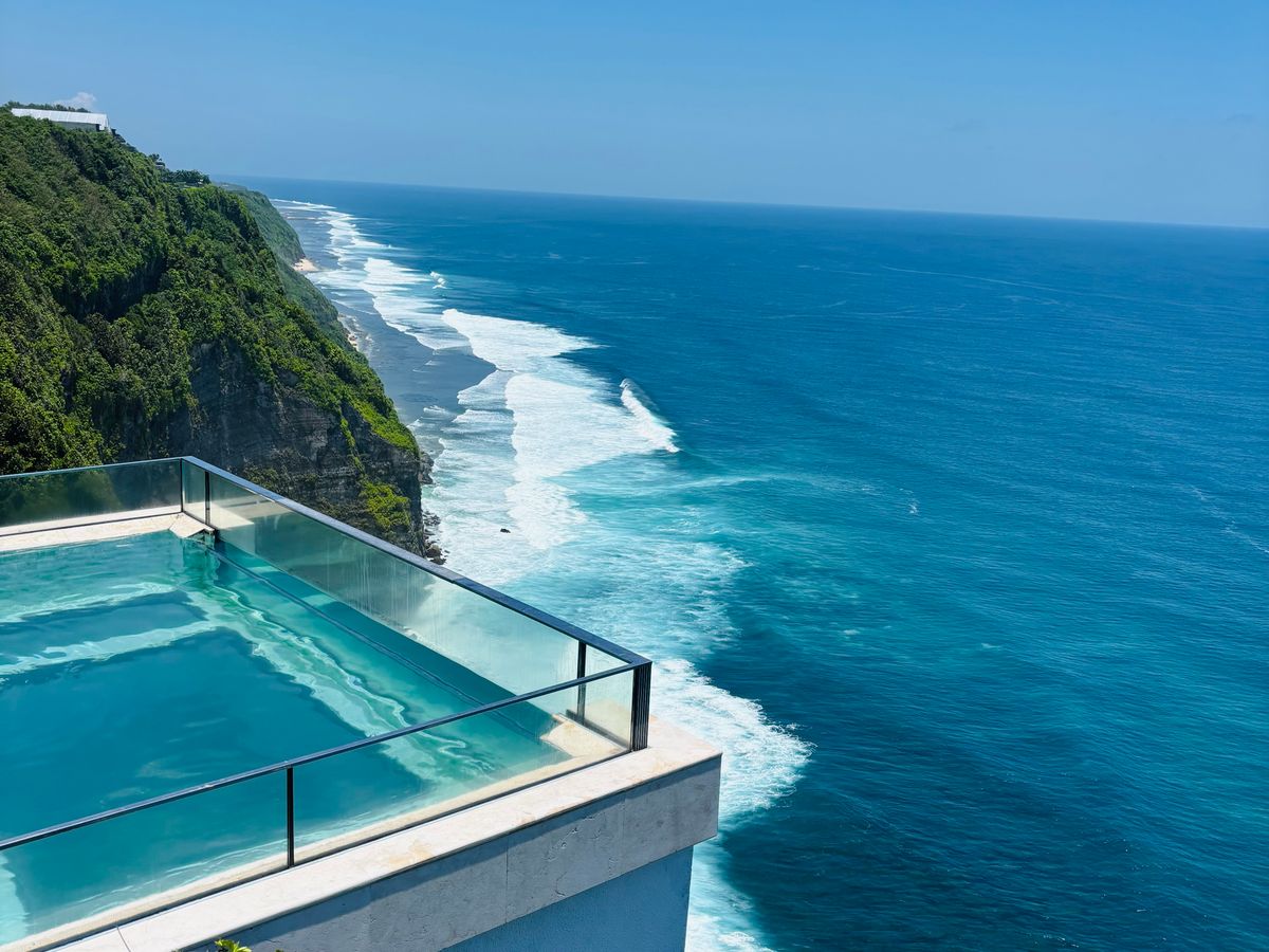 プールは思ったより小さかったですが、崖の上のガラス張りのプールとその下に広がるインド洋の景色はとても綺麗でした。