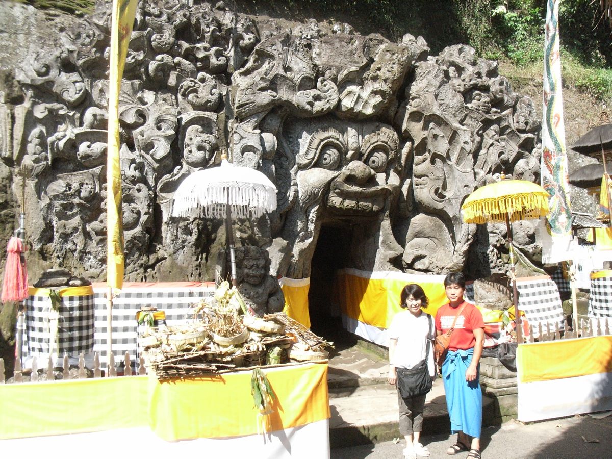 初めにCARIKの棚田に向かいました。私が泊まったクタのホテルからは結構距離がありました。途中左右の民家が素晴らしく、見事な彫刻飾りのついた塀や建物に圧倒されました。時間があれば車を降りて、周辺を散策するのもいいと思います。その先でARショップという土産物店でクルマを止めてもらいました。民芸品やお菓子など、手頃なものがすぐ見つかります。その後、Tegallalang通り沿いには延々と木彫り、モニュメント、ブリキ製の動物や鳥などの飾り物を売る店が続き目を楽しませてくれます。また、色ガラスのランプシェードもゆっくり見たかったのですが、これも時間が気になって次回の楽しみにすることにしました。CARIKのライステラスが見えるレストランは、涼しくて食事にも満足できました。ただし、この近辺はたくさんの観光客の車が集まり混雑します。続いて洪水の後オランダ人によって発見されたというGOA GAJAHの遺跡を訪れました。インドネシア独特のレリーフに飾られた象の洞窟に入りました。象の洞窟は、内部構造からそう呼ばれているようです。最後にケチャダンスを鑑賞しました。非常に長時間にも渡り、一つのストーリーを大勢の人が演じます。よくあそこまで声が揃うのものだと感心しました。これだけは一度見ておく必要があると思います。蚊がたくさんいるので、虫除け持参をお勧めします。