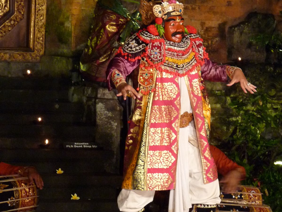 夕食後、バリ舞踊を見るために少し早めに王宮へ。ラッキーな事にちょうど有名なサダ・ブダヤ舞踊団が王宮でレゴンをやる日でした。人気らしく会場はとても混んでいて、椅子席は後ろしか空いていなかったのですが、舞台正面のカーペットに直接座る正面最前列で観ることができました。薄いカーペット一枚で長時間座っていられるか心配でしたが、ダンスが始まるとその美しさに足の痛さも忘れて見入ってしまいました。