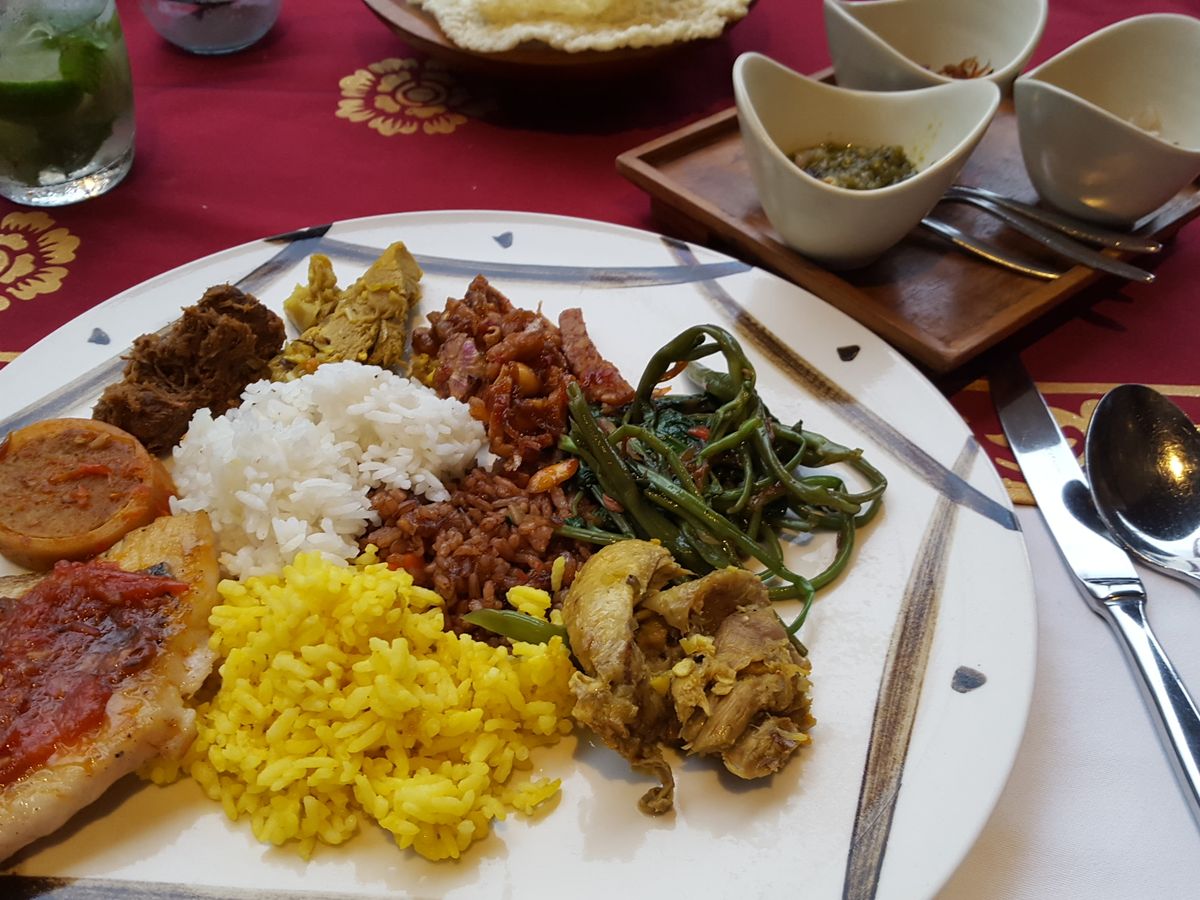 昼ごはんはインドネシア料理のバイキングです。キンタマーニ高原からの眺望も、着いた後に霧が立ち込めてしまい、ぎりぎりのタイミングで到着でした。お料理は普通です。トイレはこの後よりはキレイとのことですが、あまりきれいではありません。紙もありませんでしたので持参したものを使用しました。