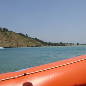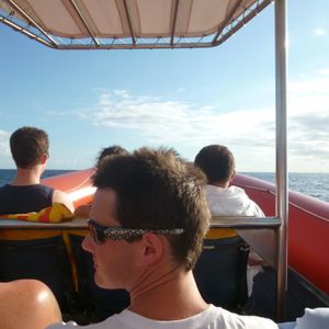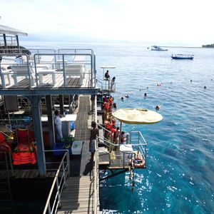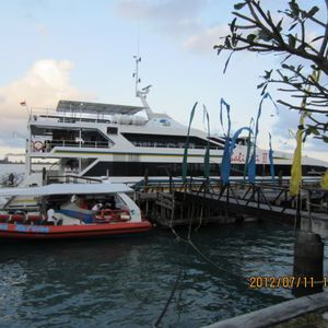 ブノア港から船で約1時間でペニタ島の少し沖にあるクイックシルバーの浮島につきます。日本人は私たち二人だけ。ほかは中国人、韓国人、そして一番大多数なのがジャカルタから修学旅行でバリ島に来たインドネシアの中学生。船の中は終始にぎやかでした。また、船はとても揺れます。私は酔い止めを飲んでおいたので何とか大丈夫でしたが、船酔いする方は酔い止めを必ず飲んだ方がいいと思います。