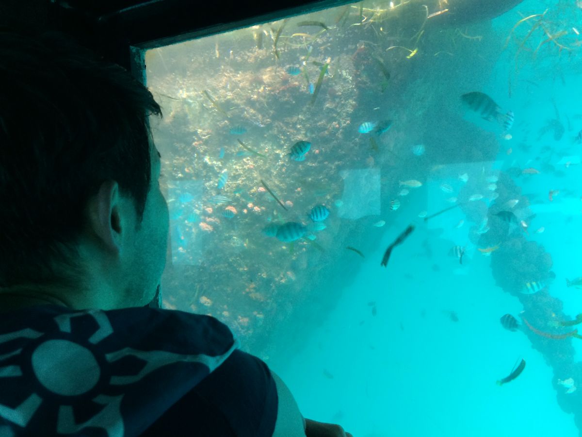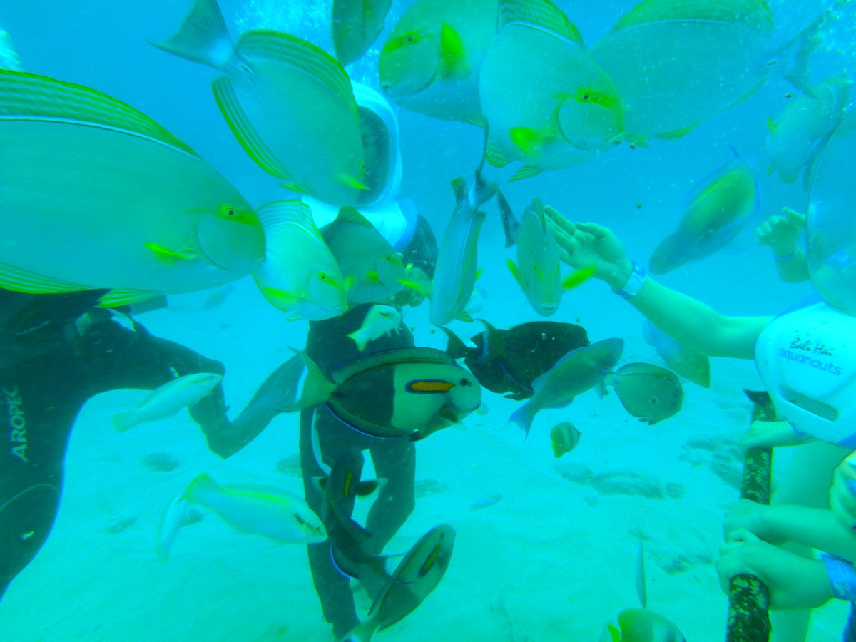 それでも、アクアノットでは、間近で大量の魚を見ることができ、海底を歩くという不思議な感覚を体験できたことはとても楽しかったです。また、お昼ご飯のBBQはバイキング形式でたくさん食べられる上、味も過去に行ったリゾート旅行でのツアーでの昼食と比べてとても美味しかったです。食べながら、音楽と歌を演奏してくれているのも心地よく、様々な国からきているであろうお客さんにリクエスト曲を聞いて、その各国の国の歌を歌ってくれるというもてなしも、とても楽しかったです。そして何より、海がものすごくきれいで、特に太陽が出ているときの海と空の色は、この旅行の中でも心に残るほどにきれいな光景の一つでした。