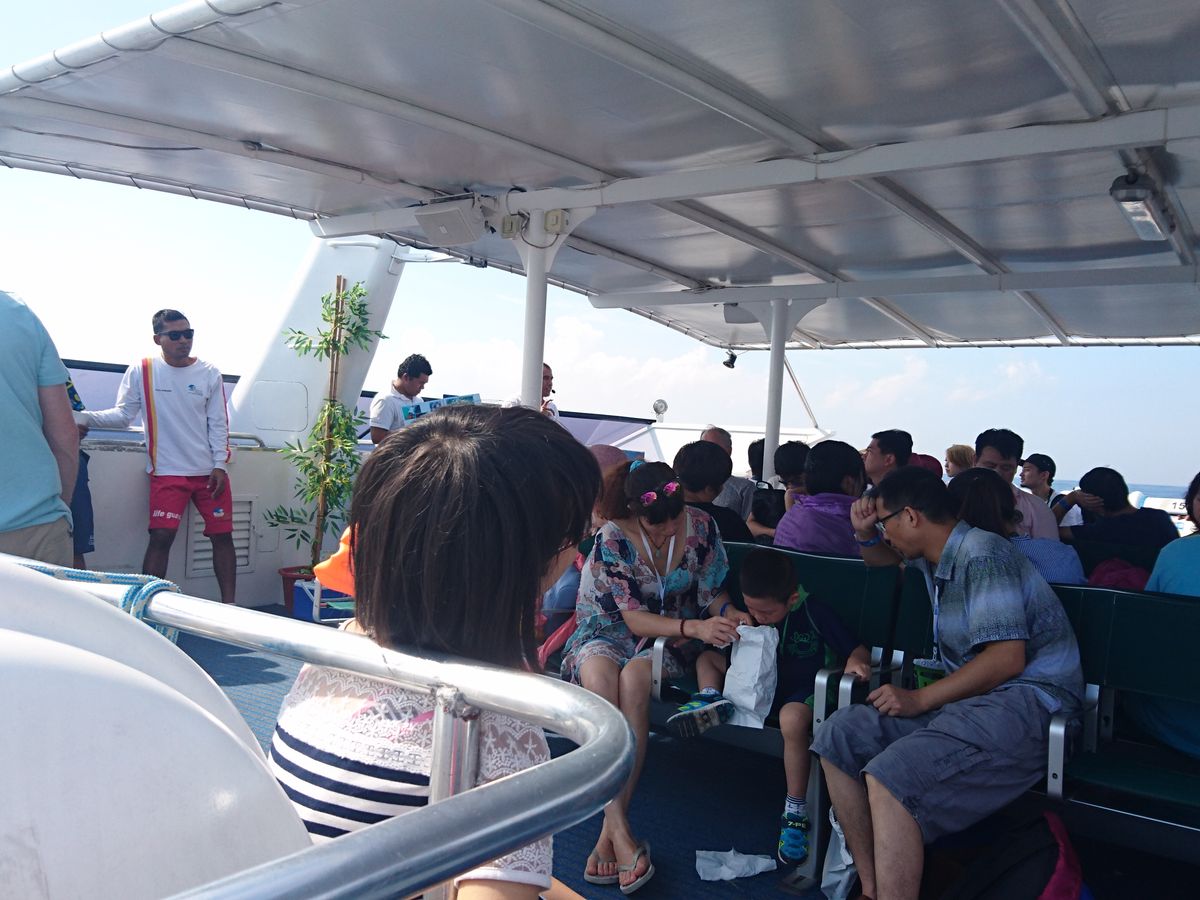 クルーズって感じで乗った瞬間はテンションが上がりましたが、1時間以内に何人も船酔いし、次々に嘔吐しダウン。私も行きは無事でしたが帰りはダウンし横にさせてもらいました。それでも気持ち悪く、とにかく船酔いとの戦い。そのため、島に着いてからのバーベキューもろくに食べられず、最初の1時間は寝込みました。シュノーケリングも行きましたが、30分ととても短く以前行った宮古島ほどキレイではありませんでした。
