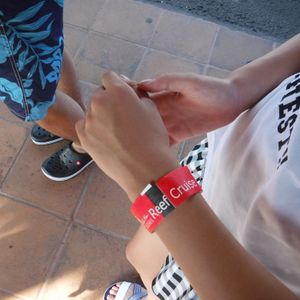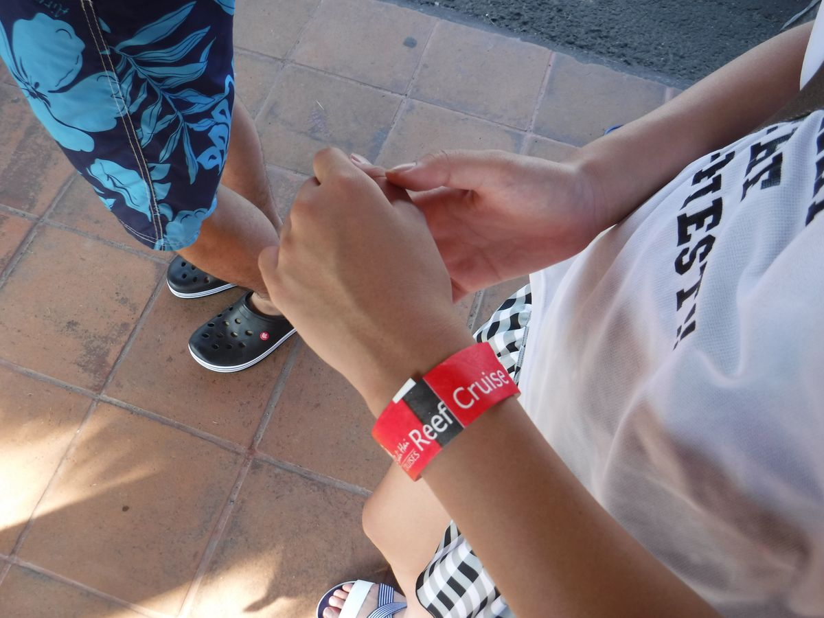 バウチャーを見せたら体験ダイビングは奥の受付に案内され必要事項を記載して、リストバンドを巻かれ、船に案内された。