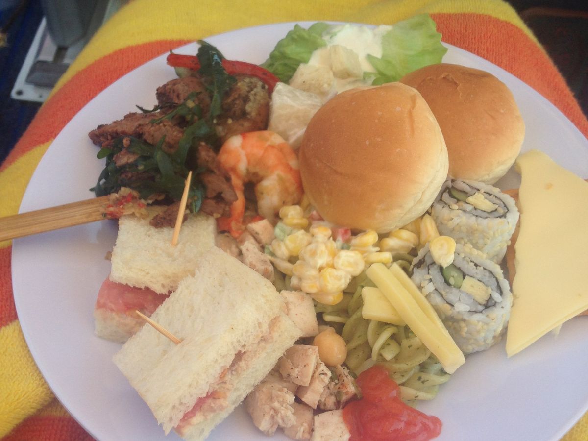 食事は船内ででるのですがクーラーのおかげで小声そうだったので浮島まで食事を運んで食べました。