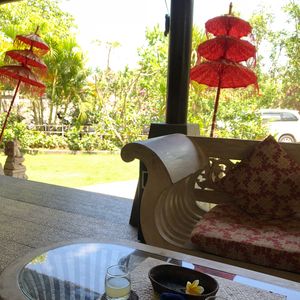 スミニャック地区のホテルに迎えを頼み、1時間かからずに到着。到着すると最初に生姜の温かいドリンクを飲みながら、マッサージに使うオイルの香りを選び、食事メニューを決めます。