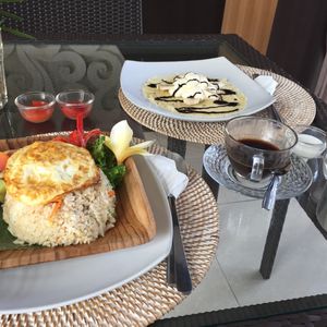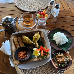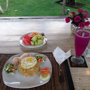食事つきだったので、ナシゴレン、ドラゴンフルーツジュース、盛りだくさんの果物もおいしくいただきました。