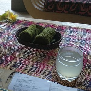 初のバリ島!帰りの飛行機が夜便だったので、最終日の夕方に3時間コースのスパを予約。集合時間より早めにドライバーさんが待機してくれていました。集合場所から40分程車に揺られれ山奥にあるスパへ到着。芝草が綺麗に整ったアプローチを進み、日本語が上手な女性スタッフがお出迎えして下さいました。最初に出して頂いたウェルカムドリンク(レモネードのような)がとても美味しかったです。