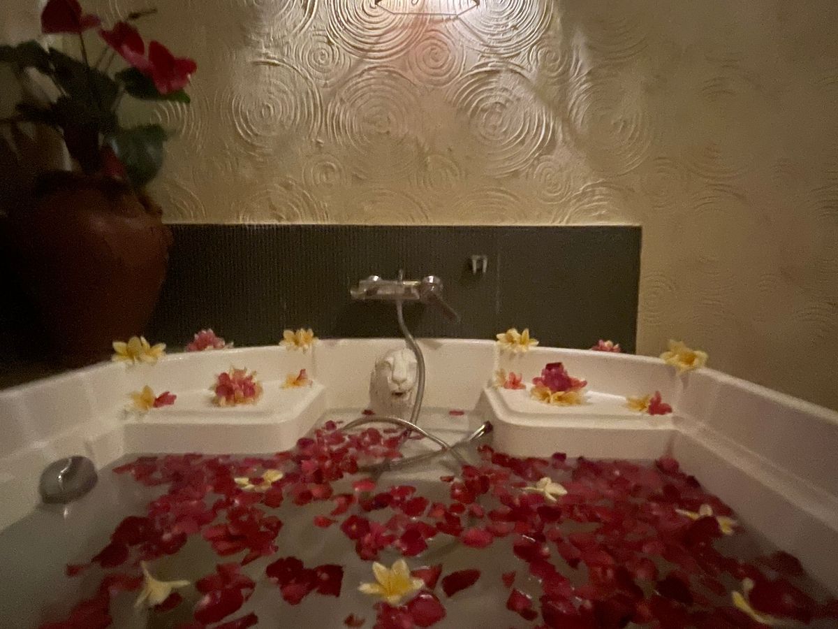 貸切のお部屋で、フットバス、ボディマッサージ、フェイスパック、フラワーバス、ヘッドマッサージをしてもらいました。