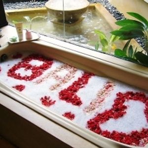 スクラブが終わって、フラワーバスに入るところでビックリ。お風呂の泡と花びらできれいに文字が書いてありました。お風呂も花の香りでとっても心地よかったです。