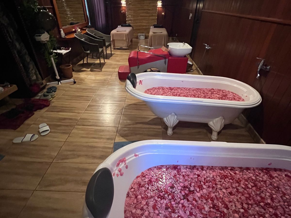 スタッフの方皆さんが笑顔で、マッサージ中もこまめに声かけして頂き心地良い時間が過ごせました。担当してくれた方は終始気遣いをして下さり技術もかなりの腕前かと満足度でした。あまりの気持ち良さに何度も寝入ってしまいました。憧れのフラワーバスに入れてとても素敵で贅沢な時間を過ごせました。フラワーバスに入りながらバナナジュース&クッキー最高です!最後にシャンプー&ブローまでしていただき充実した4時間コースでした。機会が有りましたら是非もう一度伺わせていただきます。お世話になりました!
