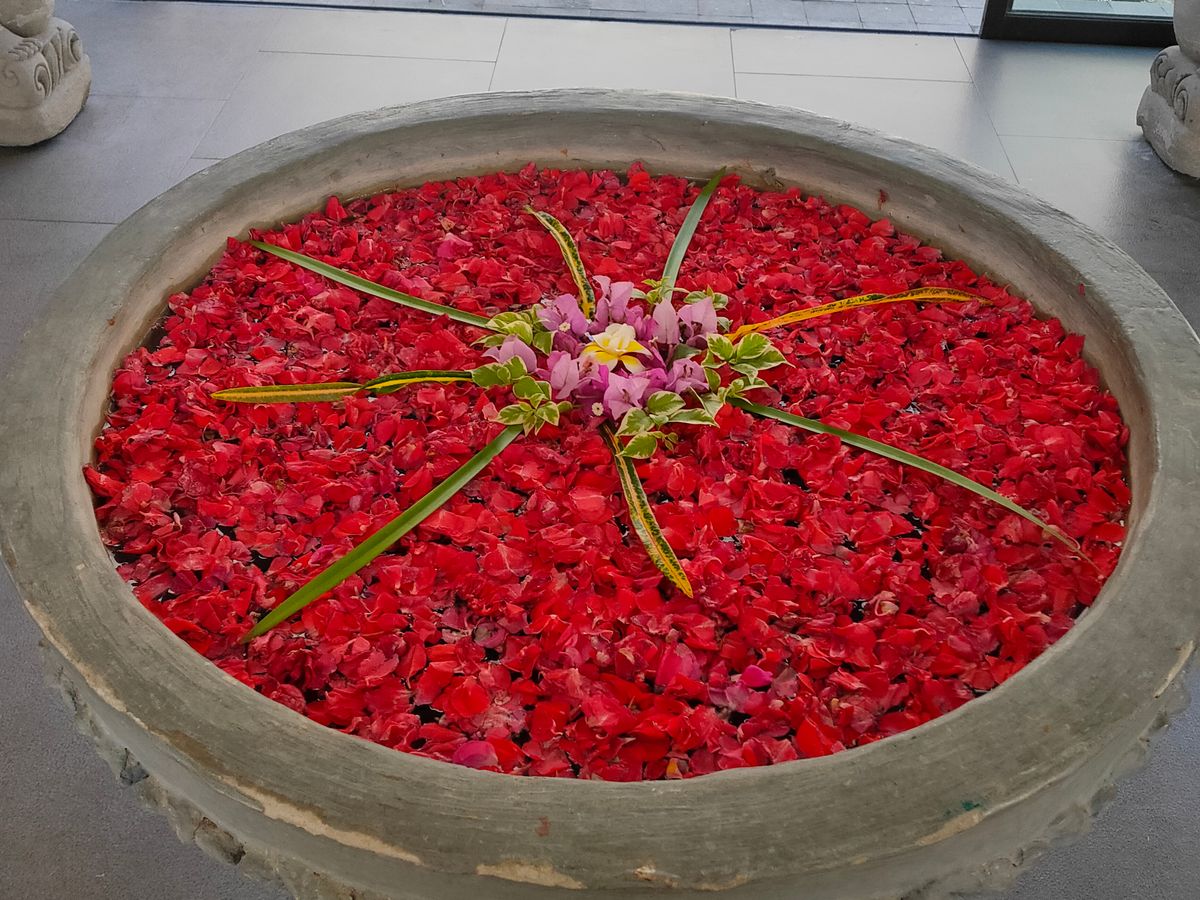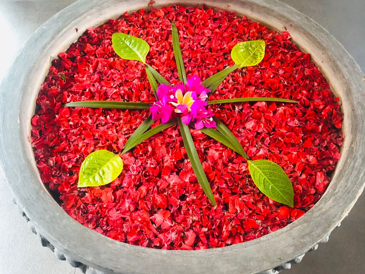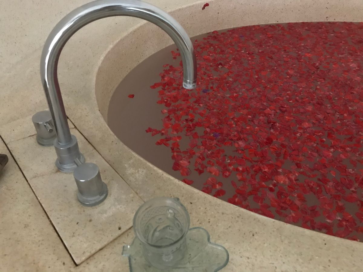 最初のフットマッサージは、マッサージというよりは、足の洗浄かなって感じです。ボディパックのあと部屋の庭に出ると、フラワーバスがありました。お湯はぬるめです。日本人だからそう感じるのかも知れませんね。シャワーのお湯は温かいので、シャワーで身体を温めてました。