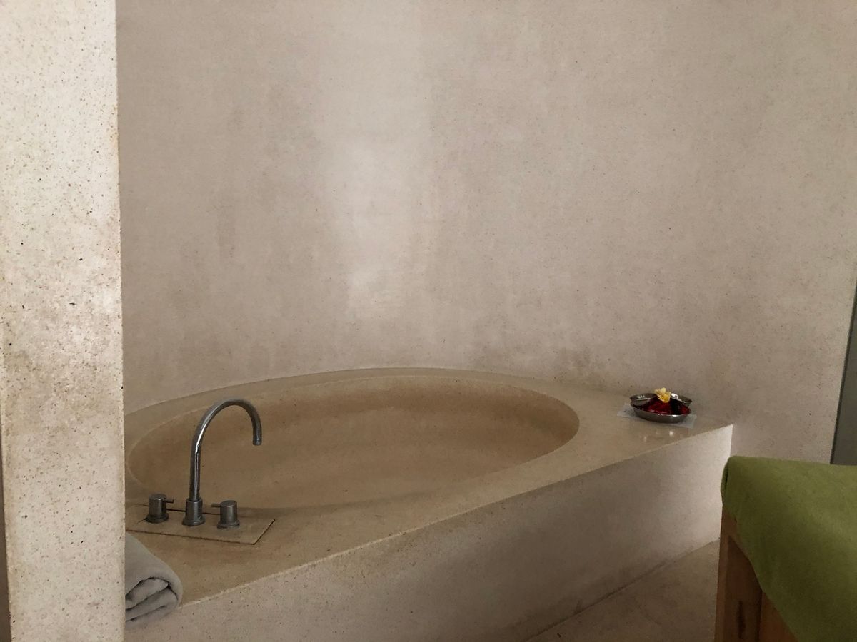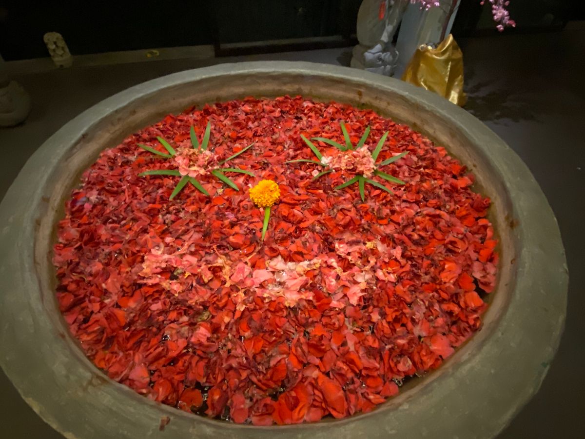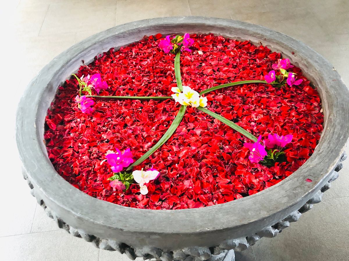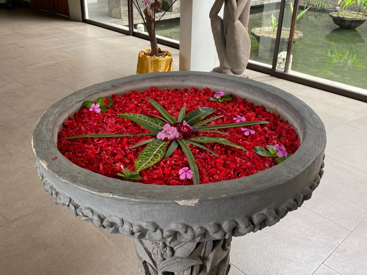 最初のフットマッサージは、マッサージというよりは、足の洗浄かなって感じです。ボディパックのあと部屋の庭に出ると、フラワーバスがありました。お湯はぬるめです。日本人だからそう感じるのかも知れませんね。シャワーのお湯は温かいので、シャワーで身体を温めてました。