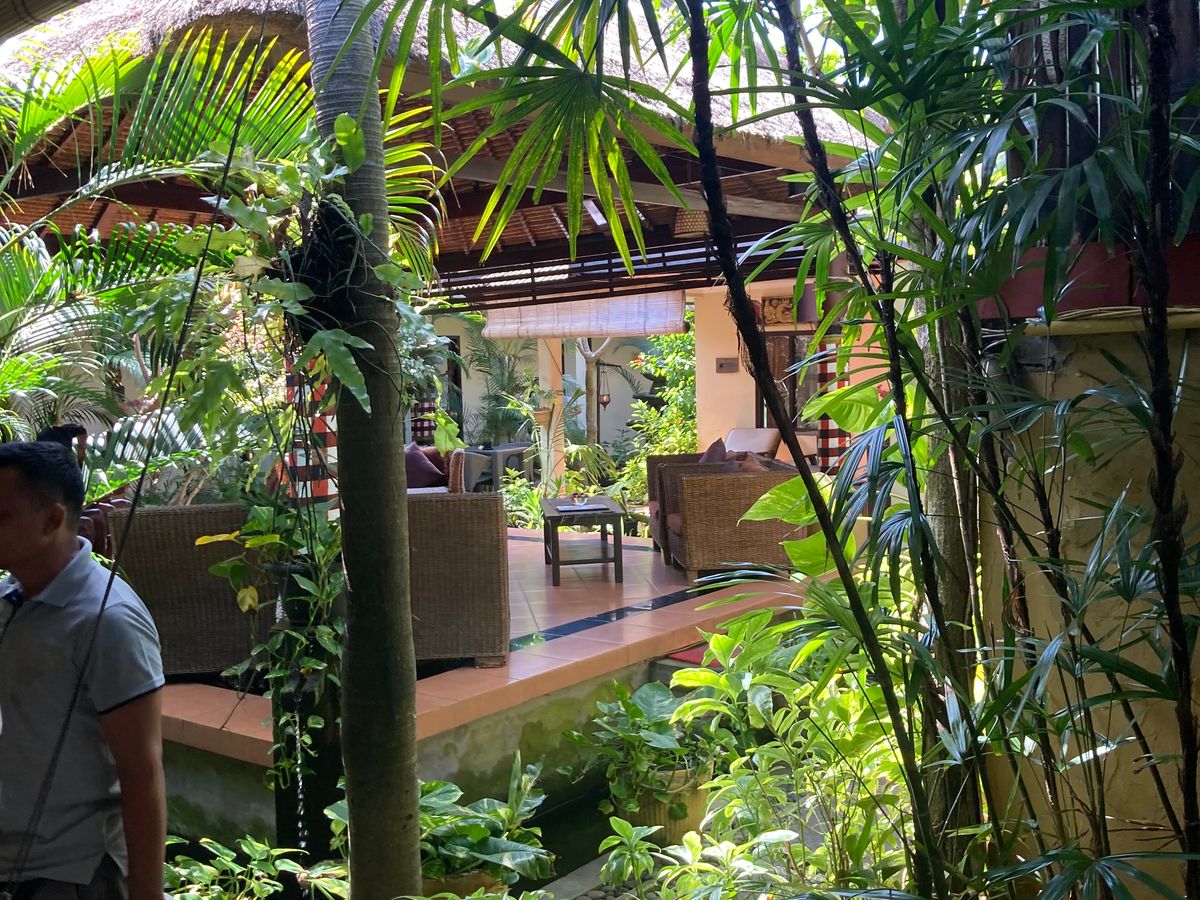 建物の中心にテーブルや、ソファーがあります。あいにくの雨でしたが、ソファー席には団体の方がいたので、準備された席につき、ミーゴレンをいただきました。味は普通です。ただ、雨漏りしており、食事をしていても雨が落ちてくるので落ち着きませんでした。この時点でスタッフの方はどこにもいないので、早々に食べて、ホテルまで送ってもらいました。