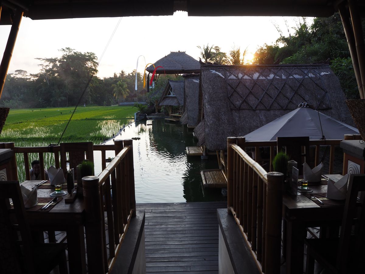 ・ディナーでインドネシア料理の中でも麺が食べたいと伝えたところ、少し考えて田んぼの間にある池の上に作られた伝統的な竹製のバンガロー風の個室のあるレストランを案内していただきました。そんなに遠くもなく、夕日も見れて本当にすばらしいチョイスでした。