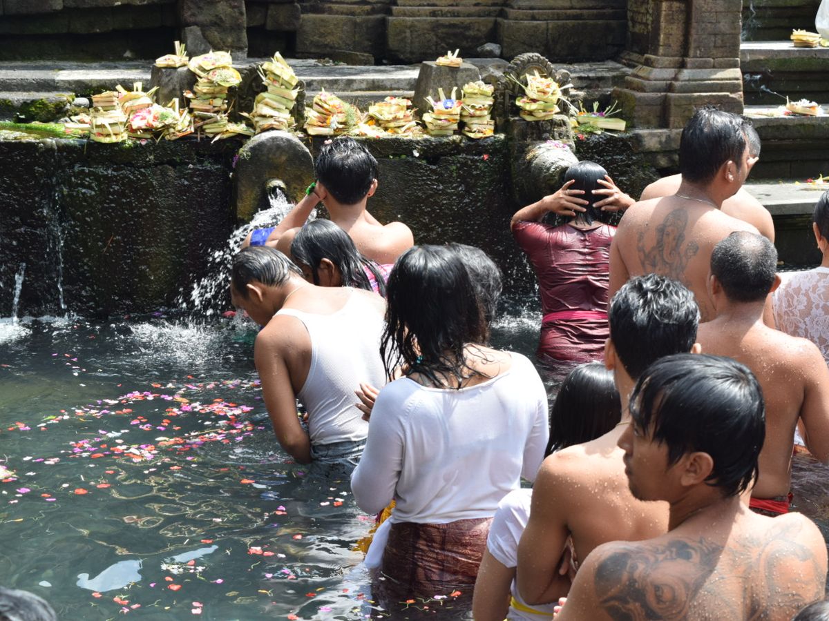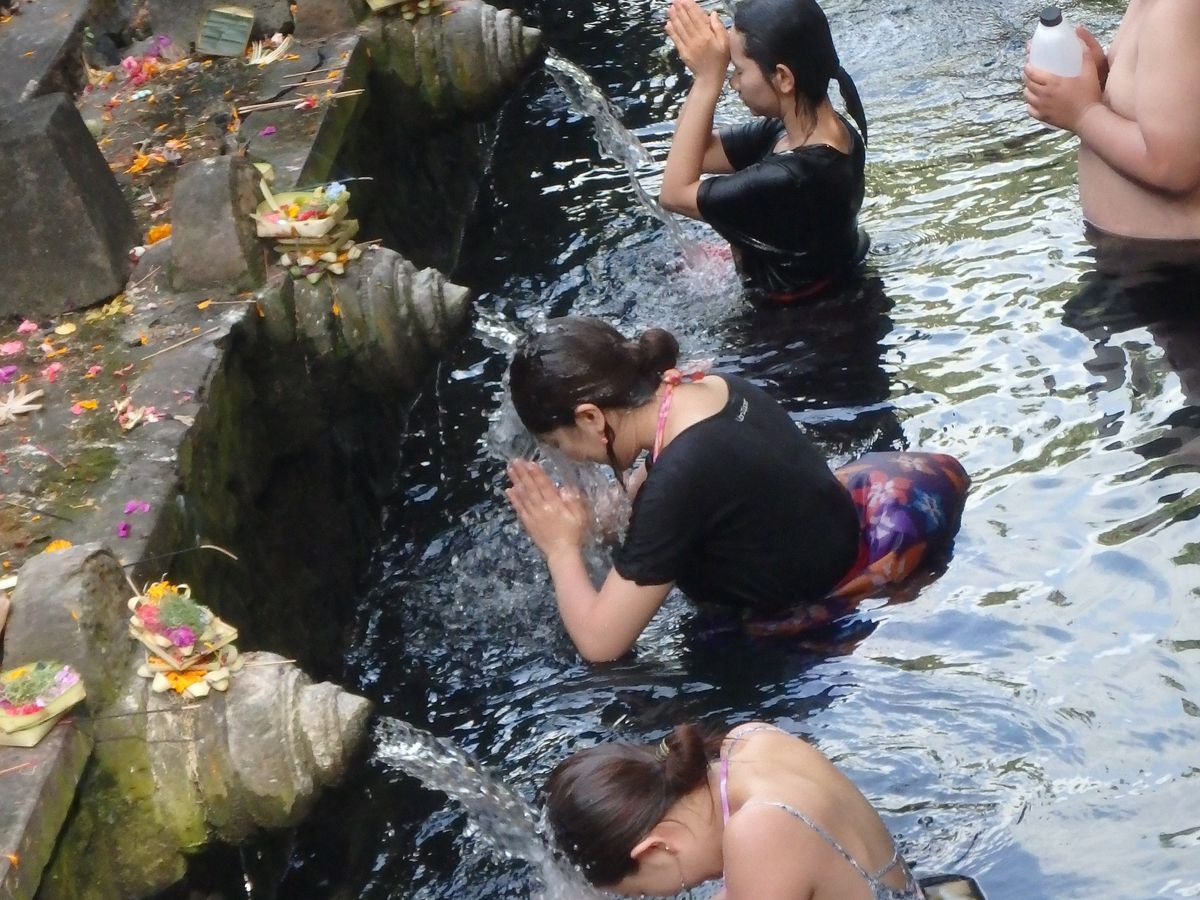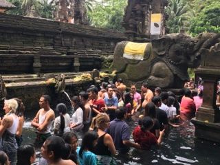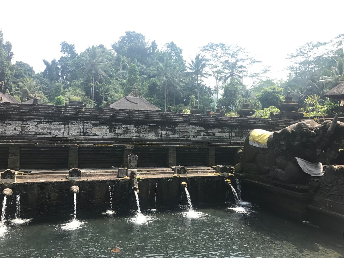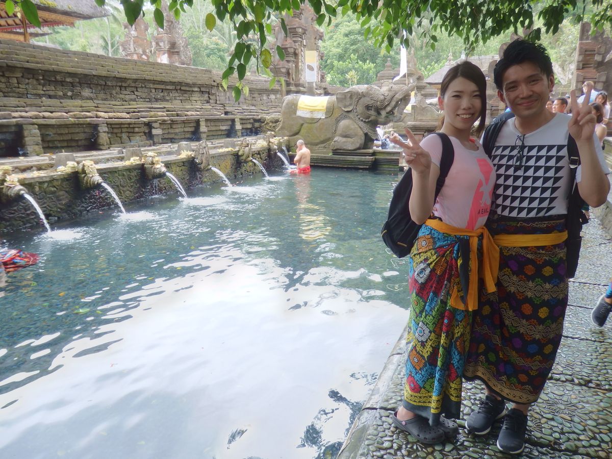 ずっと楽しみにしていたティルタエンプルに行って沐浴をして来ました!ガイドさんも優しく日本語も上手なので安心です。行きの車の中で1日の流れを説明して下さりスタート。その時に泊まっていたホテル周辺の情報やお店なども教えて下さったので凄く助かりました。ライステラスでは写真撮影のみの立ち寄りでしたが、とても綺麗な眺めでうっとりしました。昼食はキンタマーニ高原がよく見える場所でランチブュッフェ。こちらはインドネシア料理の種類も多くてガッツリ色々な種類が楽しめます。野菜もフレッシュでした。ただ料金は別料金のビールもつけて1人15万ルピア程だったので他の飲食店に比べると高めです。待ちに待ったティルタエンプルでは沐浴の前にガイドさんから説明がありスタート。こちらの水、そこそこ冷たく深さも割とありました。へそ上10センチくらい?、、何より怖かったのが中に30センチ位の大きな魚がうようよいます、、!魚と同じ場所に入りながらひたすらお祈りを済ませます。途中からは水温も気持ちくなり、魚にも慣れ、なんだか神聖な気持ちになりました。こちら脱衣所などはなく唯のロッカーしかないので、小学生の時にプールで使っていたようなボタン付き巻きタオルなどあるとかなり便利です。むしろ沐浴するなら必ず持って行った方が楽です。