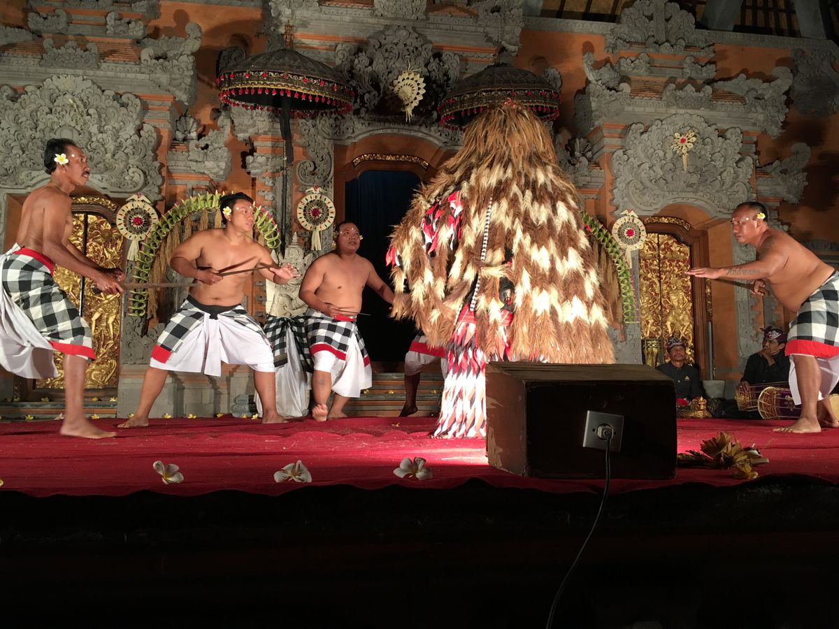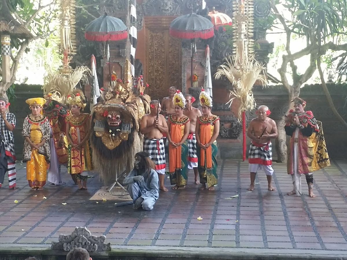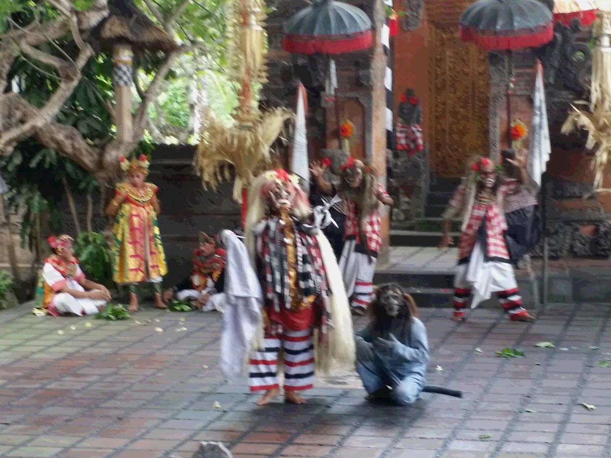 バリの伝統舞踊を鑑賞しました。9時30分からでしたが、私たちが一番ノリ、1時間前について、バロン舞踊の事を聞き、あれよあれよで9時半になり、始まったら、1時間はあっという間に終わってしまいました。日本の獅子舞とよく似ていました。