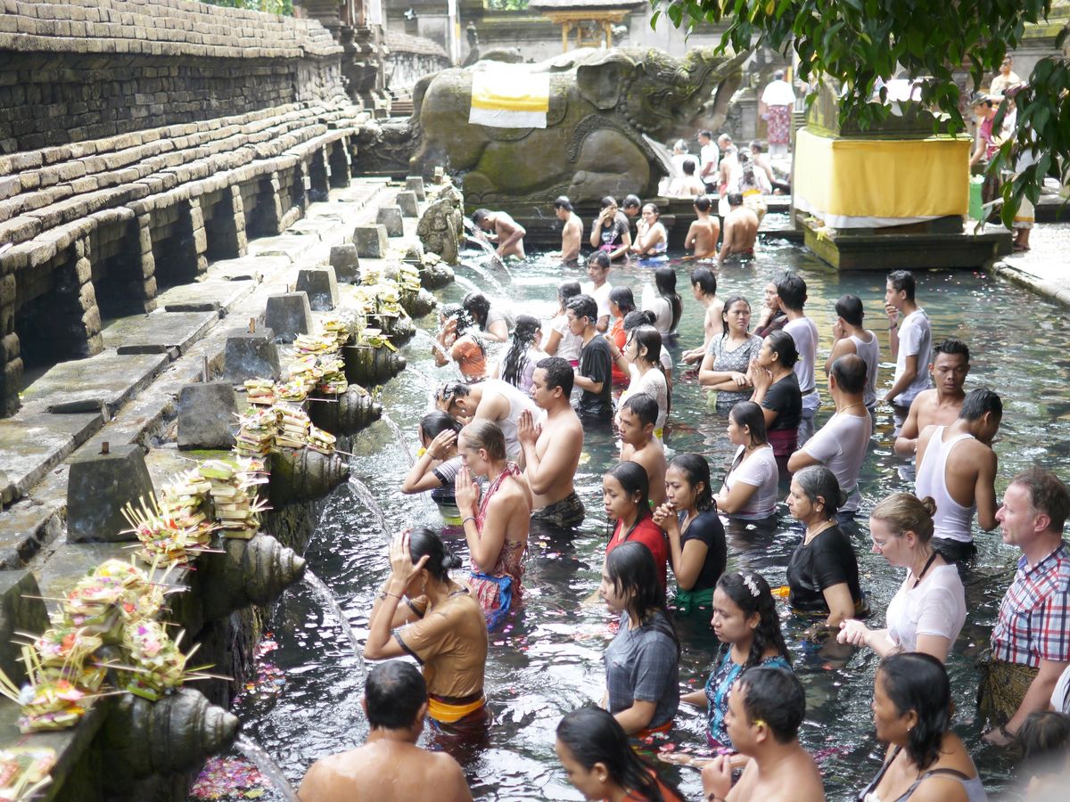 3箇所目のティルタ・エンプル寺院。こちらでは腰にかわいい布を巻いて入ります。聖なる水に触れてお願いごとを…。