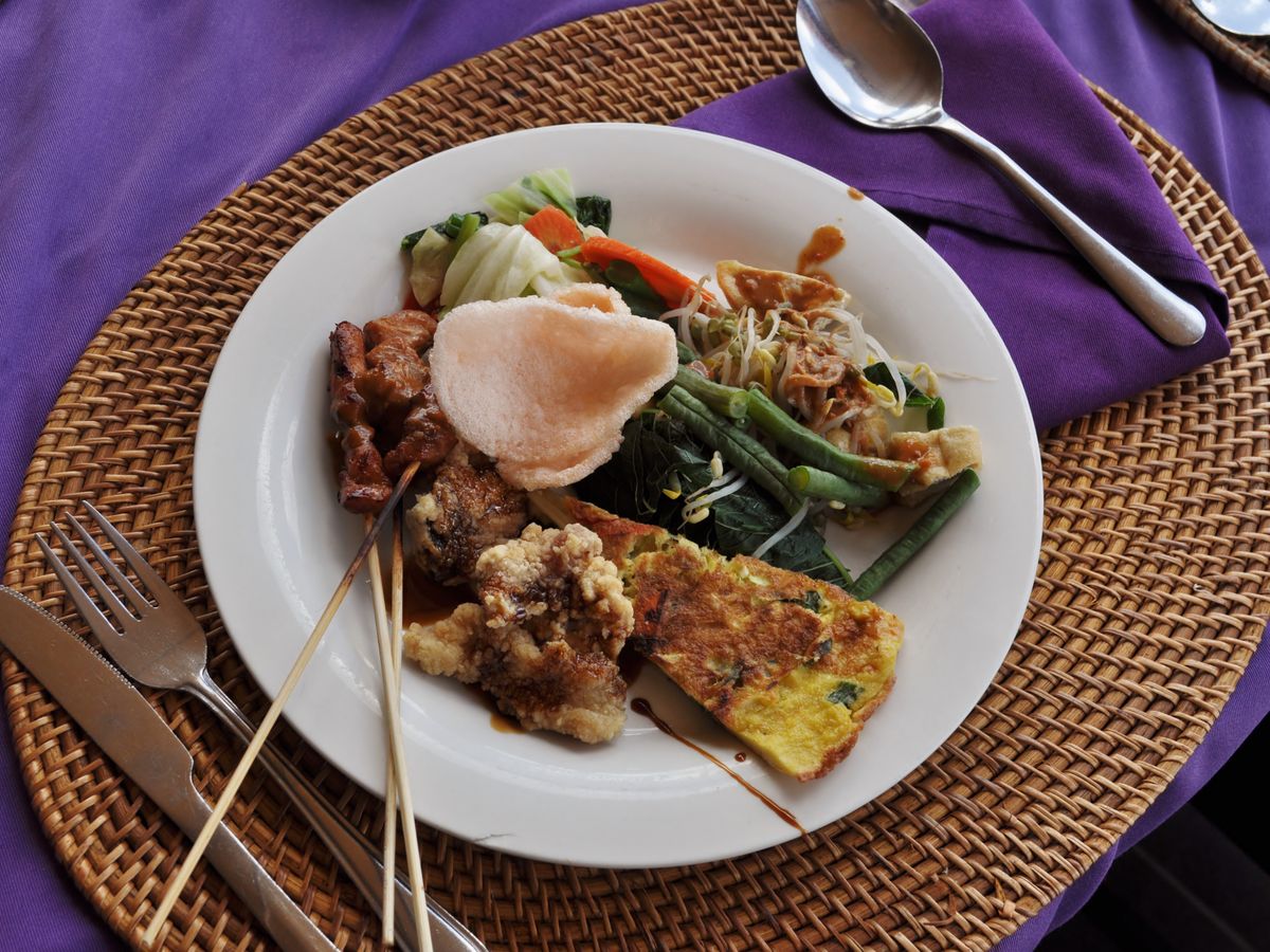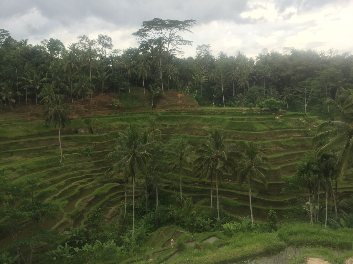 棚田ではちょうど雨が降ってきたのもあり散策はせず、ジュースを飲んでカフェで30分ほどゆったり棚田を鑑賞。狭い道路には車がいっぱいだったが、道に出たらすぐに車が来てくれてよかった。うぶ度の町に着くころには雨も止んで、ガイドさんと一緒に食事に行くか自分たちで探していくかと聞かれて、よりゆっくり時間が使える後者を選択。2時間以上時間があったのでゆっくり買い物をしたり、インドネシア料理も食べることができた。そこのレストランは、ガイドさんの話に出てきていた昔ながらの家をレストランに改装したもので、独特の門、いくつもに分かれた建物があり、催事が行われるようなところもあって興味深かった。