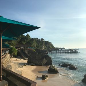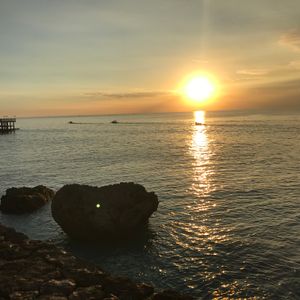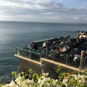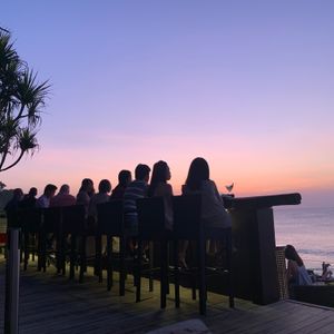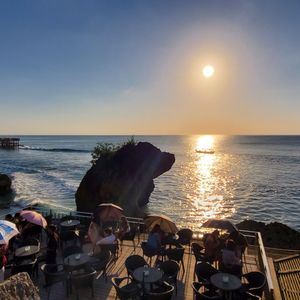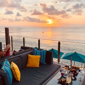 アヤナリゾート&スパに滞在しましたが、オプショナルでロックバーとディナーを体験しました。サンセットが眩しく、岩場の上のバーにて