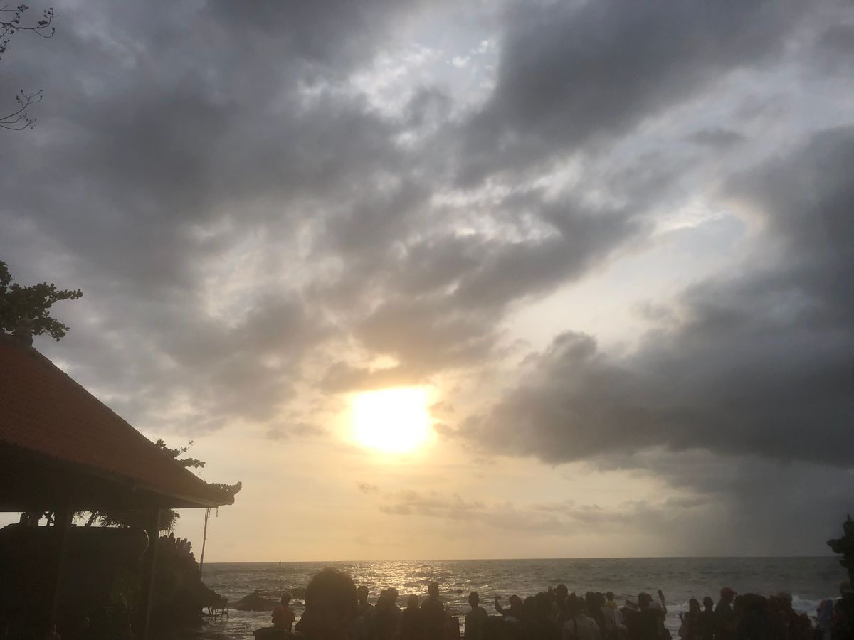 タナロット寺院はすごい人で、日没30分以上前からガイドさんにここベストポジションなので待っててください、と言われ、汗だくでした。