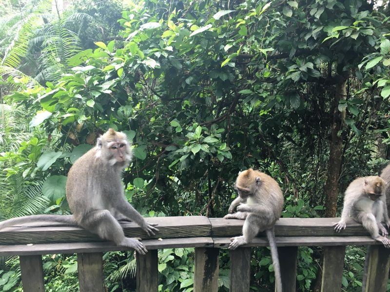 舞踏鑑賞までに時間が余ったので、ガイドさんから離れてウブドを散策しました。スケジュールの消化具合等によっては、この散策の時間は取れないかもしれません。ウブドは小さな商店や眺めの良いカフェなどがあるこぢんまりした町で、散策がてらにちょっとした買い物をするのにはちょうど良いと思います。モンキーパークの近くでは、道路や電線を猿が歩いていたりします。