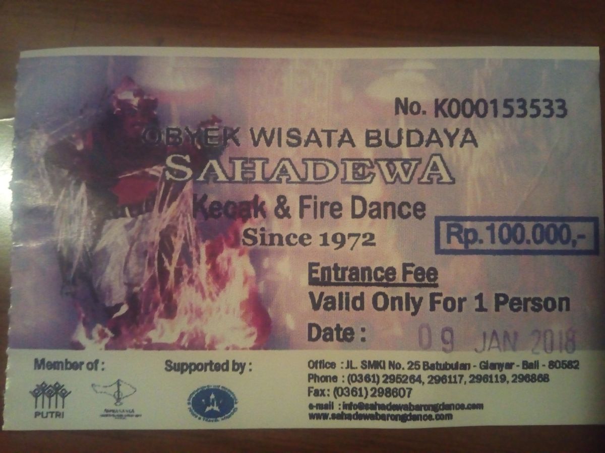 オプションですが、このツアーで最も良かったのがこの舞踊鑑賞でした。バロンダンス、ケチャックダンスとあともう一つのダンス(名称は失念しました)の3つから選択できるのですが、一番人気のケチャックダンスを鑑賞しました。写真はチケットです。表示の通り100,000ルピアでした。