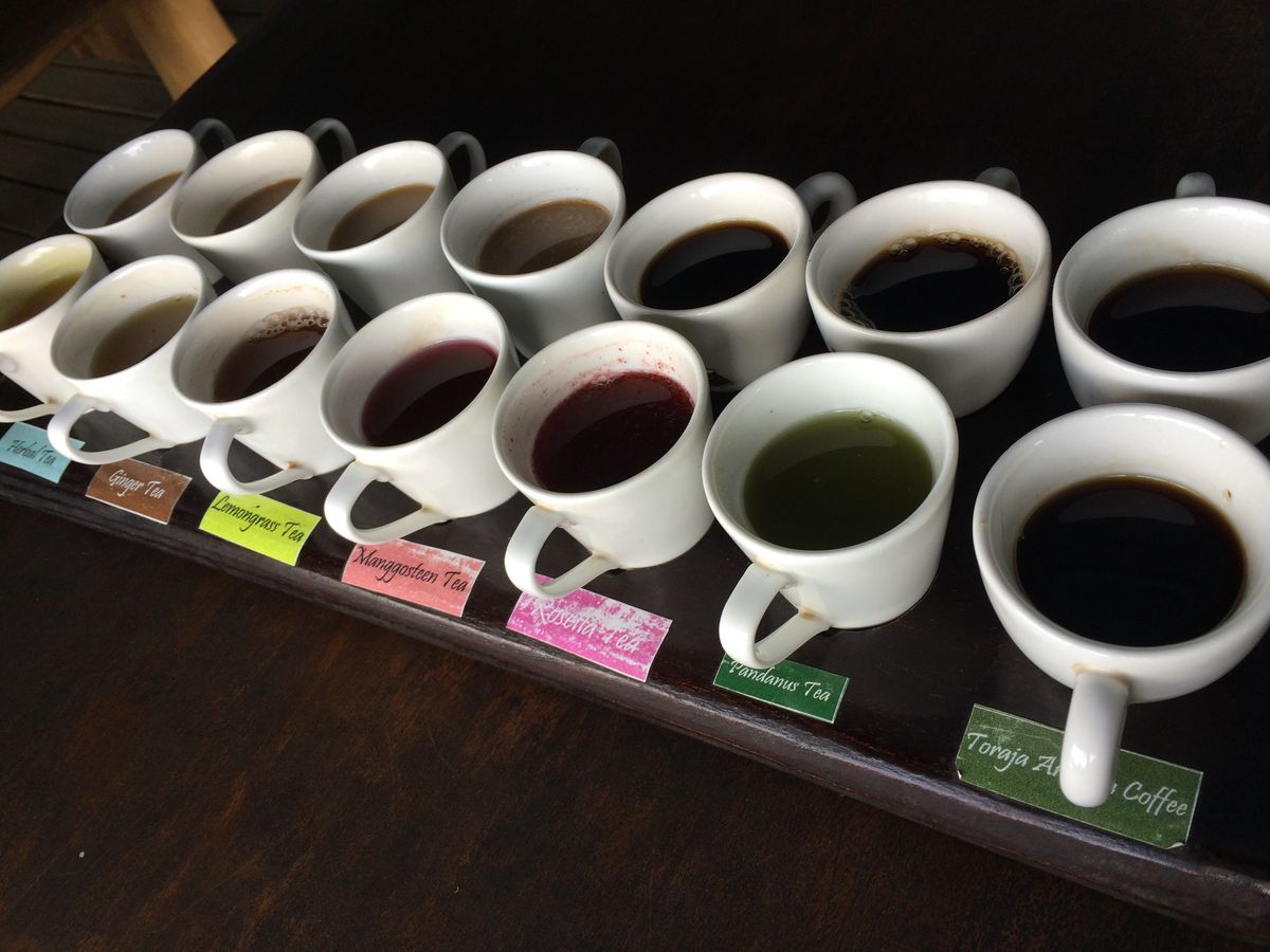 香りの良いオス.メス2種類のコーヒーを飲み比べ、その後14種類のコーヒーやお茶の試飲は大満足でした。