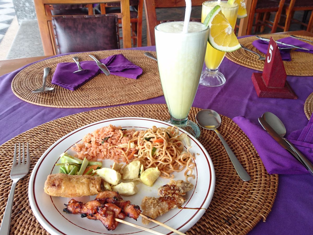 ブキッジャンブルを見てその後お昼へ。私たちは小食で油ものが苦手と伝えましたが、外国人ツアー客のお決まりの昼食会場のようで、特に聞かれること無くLereng Agungというバイキングレストランへ案内されました。景色の良い場所ですが料金は一人11万ルピア。これも後で知りました。料理は、ナシゴレン、ミーゴレン、春巻き、チャンプル、豚串、卵焼き、バナナの天ぷら、フルーツ、コーヒー、紅茶程度。